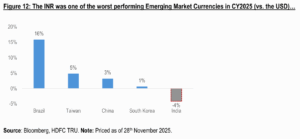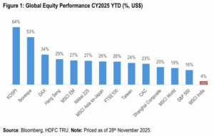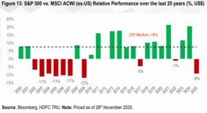 - While it’s clear that India has underperformed against all major global indices this year, we note that the narrative of regional underperformance in 2025 extends beyond just India; even the highly dominant US market registered major underperformance relative to the broader global markets.