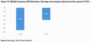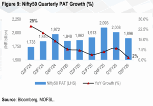 - The second critical factor was a noticeable deceleration in corporate earnings growth. After a period of robust recovery post-pandemic (FY21-24 PAT CAGR of ~26%), the pace of Profit After Tax (PAT) growth for Nifty50 companies slowed considerably in FY25 / H1FY26 to 5% y/y.