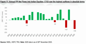 - A significant driver of India’s underperformance was the consistent and substantial selling by FPIs. CY2025 witnessed cumulative FPI outflows totaling approximately $18bn. This marked the highest calendar year outflow since 2002 and represented a stark reversal from the previous year’s trends.