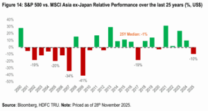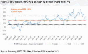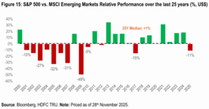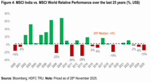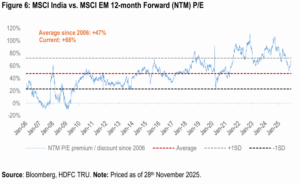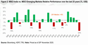 - We also note that, the relative underperformance of the Indian markets vs. the MSCI EM and the MSCI Asia (ex-Japan) Index in CY2025 (till end-Nov), is at highest level since 2000. The primary drivers of this significant underperformance were elevated starting valuations and a cyclical slowdown in both economic growth and corporate earnings.