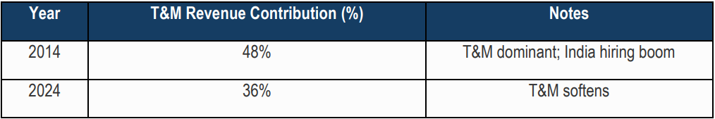 The historical shift in contract composition tells the story of the industry’s structural transformation. As recently as 2014, T&M contracts dominated the Indian IT landscape, accounting for roughly 45-50% of total contract value. Fixed-price grew as clients pushed for certainty. Managed services (long-term retainers) grew as large banks and insurers outsourced infrastructure. Now AI is reshinking the pie.