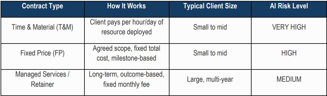 T&M contracts are the most vulnerable segment. In a T&M model, revenue = number of deployed resources × hourly rate × hours billed. When AI can do the same task in a fraction of the time – or replace the resource entirely – the billable hours collapse. This is the fundamental economic equation that AI may destroy IT services firms.