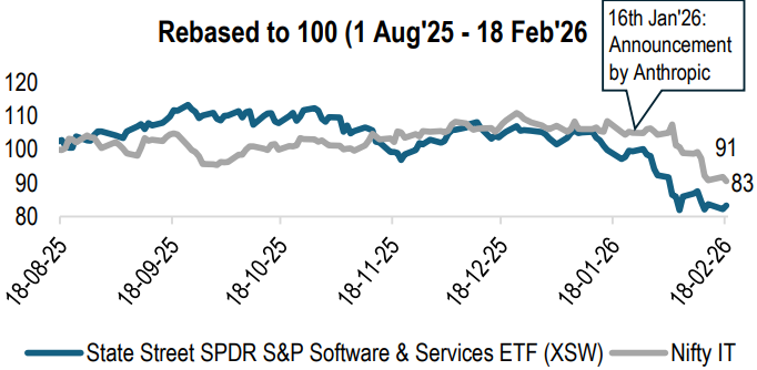 The launch of Anthropic’s Claude Cowork in early 2026 triggered a “SaaSpocalypse” that wiped out approximately $300 billion in global tech market value virtually overnight. The Nifty IT Index suffered its worst single-day plunge since the 2020 pandemic, dropping over 6% on February 4, 2026. This marked a critical inflection point for the industry, as the historical reliance on human intensive delivery faces unprecedented pressure. In this note, we assess the shifting economic reality for tech stocks and provide a breakdown of the sectors most vulnerable to autonomous AI.