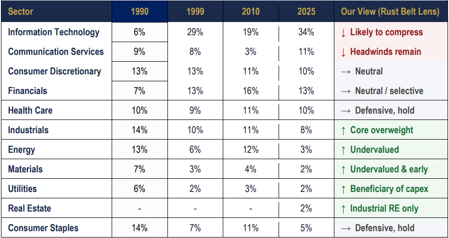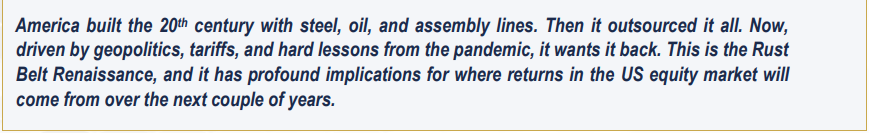 The USA is undergoing one of its most significant industrial shift in four decades, driven by tariffs, geopolitics, and a bipartisan push to rebuild domestic manufacturing capacity. Tech sector, which today accounts for ~45% of the S&P 500, is likely to face a slow but structural compression as capital rotates towards real asset sectors that are historically underweighted but central to the new American industrial order. For investors, this is not a short-term trade. It is a decade-long re-positioning away from the digital economy’s dominance and toward the hard assets that a reshoring America will need to build, power, and run itself.