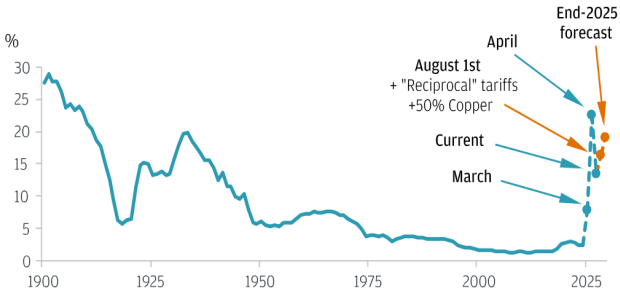 ▶The Tariff Wall. Under Trump’s second term, the average effective US tariff rate surged from less than 5% to around 20%; the highest in over a century. Steel, Semi-conductors, Autos – every pillar of the old Rust Belt is now shielded by targeted trade policy.