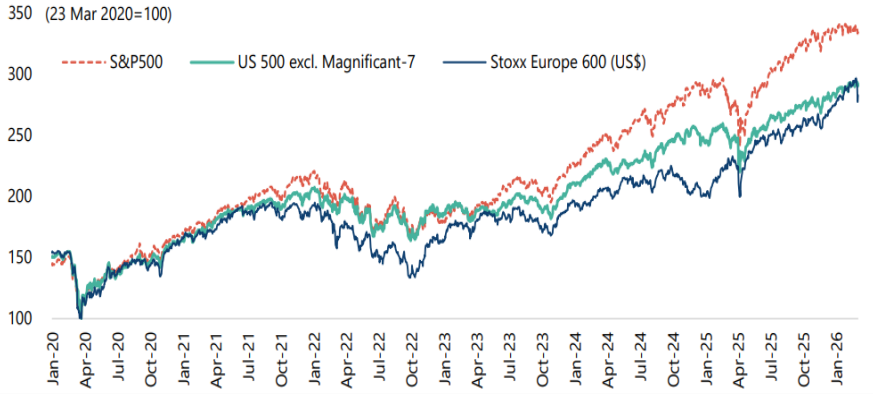 Figure – 3: Such has been the outperformance of US Tech that excluding the “Magnificent 7,” US equity returns have essentially mirrored those of Europe from the 2020 pandemic low through 2025…