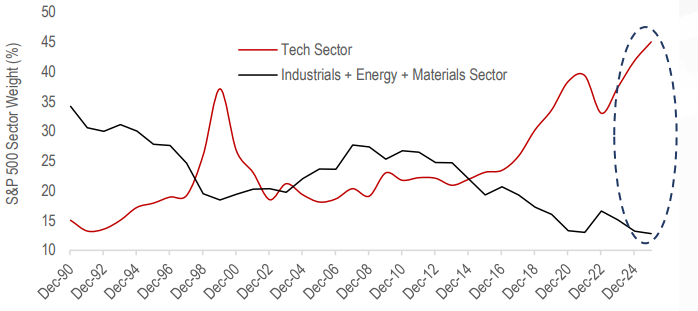 In 2000, information technology accounted for roughly 21% of the S&P 500. By early 2025, that figure had risen to approximately 34% and when you include communication services (which houses Alphabet and Meta), the ‘tech complex’ broadly construed accounts for around 45% of the index. Over the same period, energy fell from ~7% to ~3%, near its lowest share in modern history. Materials sit at ~2%. Industrials, the sector most directly tied to physical production, remains at ~8% despite representing the backbone of what the US is now trying to rebuild. These are not small distortions. They reflect a bet by global capital on the primacy of intellectual property over physical capex.