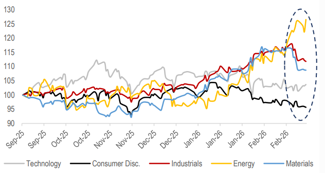 Figure – 5: Market leadership is quietly shifting as Industrials, Energy, and Materials begin to pull ahead of Technology and Consumer sectors (re-based to 100)