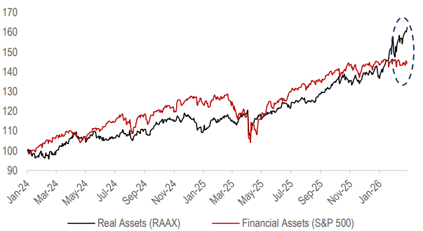 Figure – 6: Global capital allocation is undergoing a structural shift, with investors increasingly rotating away from financial assets and toward real assets (re-based to 100)
