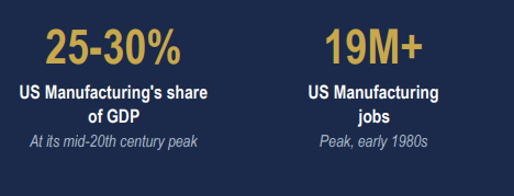 The term ‘Rust Belt’ was not always used in a negative sense. From the late 19th century through the mid-20th, the industrial corridor spanning Ohio, Pennsylvania, Michigan, Indiana, etc. was the beating heart of American economic power. It was called the Steel Belt, the Factory Belt and for good reason. This was the region that built America’s automobiles and forged its warships. It refined its oil and smelted its steel. Cities like Pittsburgh, Detroit, Cleveland, and Gary were not peripheral, they were the engine room of the world’s most dynamic economy. At its peak, manufacturing accounted for nearly 25-30% of US GDP, the US produced ~40 % of the world’s manufactured goods and millions of workers without college degrees could earn middle-class wages on the factory floor.