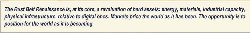 ▶Industrial Real Estate. Warehouses, logistics hubs, manufacturing facilities near reshored supply chains and not the white-collar office or luxury residential real estate of the last cycle, but the unglamorous, highly functional physical infrastructure the new economy requires.
