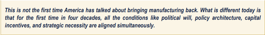 The pandemic made viscerally clear what strategic thinkers had warned for years – the US had outsourced not just manufacturing, but resilience. Semiconductor shortages idled auto plants. Property, Plant & Equipment (PP&E) was unavailable when it was most needed. Taiwan, which produces over 60% of the world’s chips and over 90% of the most advanced ones, sits just 180 kms from mainland China. The result is a bipartisan consensus that domestic industrial capacity is a national security imperative, not just an economic preference. This is the most durable of all the forces driving reshoring, because it survives changes in administration.