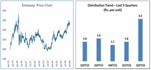 - Embassy REIT’s portfolio comprised of total leasable area of 51 msf, of which 40.4 msf was completed area and had an occupancy of 91% as of Sept 30, 2025