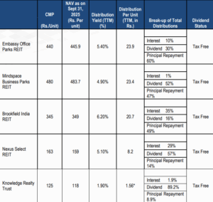 - Listed REITs in India currently offer distribution yields of 4.9-6.0%. Total returns will be influenced by completion of under construction assets, increase in rentals and increase/decrease in valuation of underlying assets.