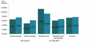 Over the past five years, the share of the housing and industrial/commercial segments in cement demand has declined, while the infrastructure sector’s share has risen significantly, jumping from 19-21% in Fiscal 2017 to 29-31% in Fiscal 2025, primarily due to a surge in government capital expenditure. The housing sector’s share declined initially due to weak economic conditions but saw a sharp post-pandemic rebound driven by factors like work-from-home trends and government schemes like PMAY.