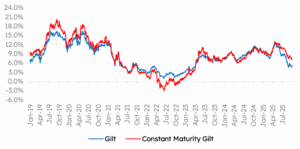 Cumulative performance: Gilt vs. Constant Maturity Gilt Funds (Jan 2018 – Sep 2025)