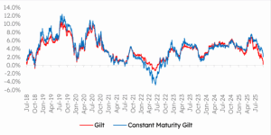 1Yr Rolling Return: Gilt vs. Constant Maturity Gilt Funds (Jan 2018 – Sep 2025)