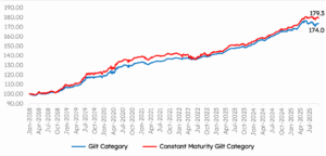 As can be seen in the table above, Constant Maturity Gilt Funds have outperformed Gilt Funds during Jan 2018-Sep 2025.