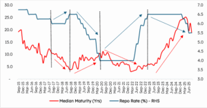 Median Portfolio Maturity vs. India’s 10yr G-sec yield (6M Forward)