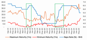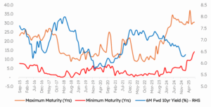 - Minimum maturity stays within a range across all periods, showing that some managers are consistently conservative regardless of policy shifts. On the other hand, changes in maximum maturity are more pronounced, especially during rate cuts or periods of high uncertainty, suggesting that a few managers actively take duration calls for capital gains.