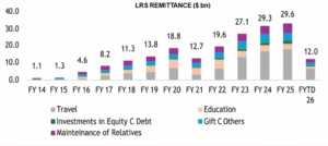 Introduced in 2004, LRS allows Indian residents to remit up to $250,000 p.a. overseas for purposes such as education, travel, investments and real estate. Over the past decade, remittances under LRS have grown from $1.1 bn in FY 14 to $29.6 bn in FY 25