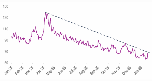 - Despite the sharp rise in global sovereign yields, the MOVE index, has remained relatively contained. This suggests that, so far, markets are viewing the increase in yields as an orderly repricing rather than a disorderly shock, with expectations adjusting in a gradual and controlled manner. However, this calm warrants close monitoring.