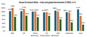 India’s consumption is projected to be driven by its young, middle-income population over the next decade. As of 2024, approximately 44% of the population is under 25, with a median age of 28 years, making it younger than major economies like China (39 years), the UK (39 years), and the US (38 years). This demographic is increasingly focusing its spending on essential investments such as education and skill development.