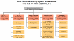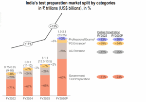India’s test preparation market is valued at ₹1-1.1 trillion (US$ 12.5-13.5 billion) in FY2025, is projected to reach ₹1.9-2.1 trillion (US$ 23-25 billion) by FY2030, with CAGR of approximately 13%. The online test preparation segment is also expanding rapidly, projected to grow at a CAGR of 29% between FY2025 and FY2030. This will increase its share of the total market from 13% to 26%, with an estimated market size of ₹500-550 billion (US$ 6-6.5 billion).
