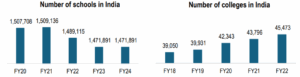 India’s education sector is one of the world’s largest. Between FY18 and FY22, the number of colleges increased from 39,050 to 45,473. However, the number of schools decreased from over 1.5 million in FY18 to about 1.47 million in FY2024, a drop attributed to pandemic-related closures and government school consolidation
