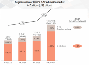 K-12 Education market: The K-12 core education market in India, currently valued at ₹6-7.0 trillion (US$ 75-85 billion), is projected to grow at an 8% CAGR to reach ₹9.5-10.5 trillion (US$ 115-125 billion) by FY30. The number of enrolments is also expected to reach 290-320 million over the same period. The supplemental education market comprises about 18% of the above. The supplemental education online segment, while currently accounting for only 11% of the market, is poised for rapid growth and is expected to increase its share to ~21% by 2030, reflecting a shift towards more flexible learning models.