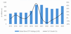 - ETF flows have played a disproportionate role in tightening the market balance over the past two years. In 2025 alone, net investment into ETFs amounted to ~200 million ounces (oz), materially exacerbating an already tight physical market. Excluding ETFs, the underlying market deficit stood at ~95 million ounces (oz); however, once ETF flows are included, the effective deficit widened sharply to ~295 million ounces (oz). Any reversal or even moderation in ETF inflows therefore poses a meaningful risk of downside volatility, as the market would need to rapidly re-absorb this incremental supply.