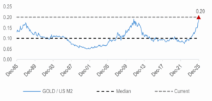 - The Gold–Silver ratio has retraced to 57, positioning it just under the long-term median of 63. Historically, lower ratios have coincided with late-cycle / risk-off phases, where forward returns, especially for Silver, tends to be muted.