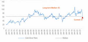 - In this context, the current Gold–Silver ratio suggests asymmetric risk for Silver, with limited upside from current levels with a higher probability of consolidation or drawdowns if macro/demand tailwinds soften.