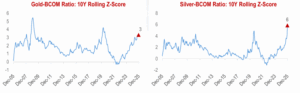 Net-net, based on 10-year rolling Z-scores vs. the Bloomberg Commodity Index (BCOM), Precious metals appear meaningfully stretched. Gold, with a Z-score of around +3, is already trading well above its long-term relationship with the broader commodity complex, suggesting more asymmetric forward returns and a higher likelihood of consolidation. Silver, however, is an extreme outlier, with a Z-score close to +6, indicating it has vastly outperformed the overall commodity basket by historical standards. Such elevated readings do not imply an immediate correction, but they do point to significantly higher volatility and downside risk, with Silver appearing far more extended than Gold at current levels.