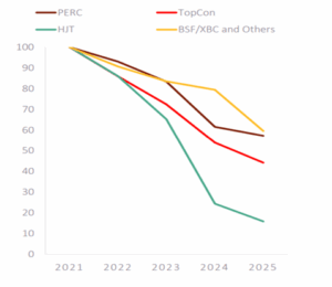 - Newer cell architectures such as PERC (Passivated Emitter and Rear Cell), TOPCon (Tunnel Oxide Passivated Contact) and HJT (Heterojunction Technology) are designed to improve efficiency while lowering material costs.