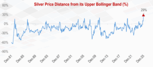 - Technical Indicators Signal Overbought Conditions. Momentum indicators suggest both Gold and Silver are currently overbought, a phase that has historically preceded consolidation or corrective moves. Such technical setups tend to compress forward returns, even if absolute prices remain elevated for some time.
