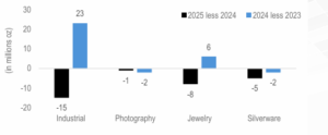Figure 16: Silver – Demand Swings by Sector; all the key segments saw a decline in demand y/y (2025 vs. 2024)