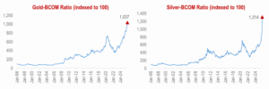 - To test whether Gold & Silver are “expensive” (i.e., stretched vs. the rest of the real-asset universe), we look at a ratio framework that compares Gold & Silver against (1) industrial commodities such as Oil and Copper, (2) Broad commodity benchmarks like the Bloomberg Commodity Index (BCOM).