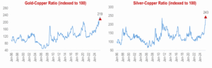 - If Gold & Silver-to-Oil and Gold & Silver-to-Copper ratios are elevated, it suggests that Silver has run significantly ahead of the commodity inputs that typically represent “global activity” (Oil) and “industrial cycle” (Copper).