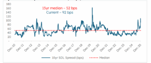 - Against this backdrop, 10-year SDL spreads over G-Secs are expected to stay elevated till March 2026.