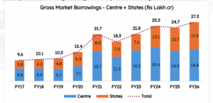 The chart above shows a steady, broad-based rise in gross market borrowings by both the Centre and states over FY17–FY26, with a noticeably faster pickup in state borrowing in recent years.