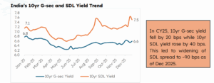 - In CY25, SDL spreads reached near 100 bps amid large state borrowings, far exceeding the 15yr median average of 52 bps.