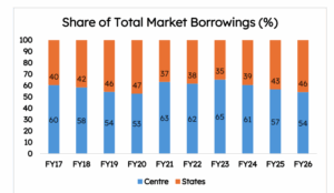 - Total market borrowings have climbed from around ₹9.6 lakh crore in FY17 to ₹27.3 lakh crore in FY26, with states contributing an increasingly larger chunk of the incremental borrowing.