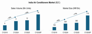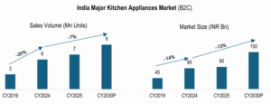 Driven by rising incomes, urbanization, and broader market penetration, India’s appliances and electronics market is on an accelerated growth trajectory. Growth is expected to jump from approximately 7% (2019-2024) to 11% (2024-2029). The overall market is vibrant across all channels: the B2C consumer segment is quickly shifting toward premium and tech-driven products, while the B2B segment is seeing strong expansion from major institutional buyers in industries like healthcare and hospitality. The retail sector is undergoing a major premiumization wave. Customers are upgrading from basic utility items to sophisticated, technology-focused products. Distribution is expansive, covering everything from e-commerce to traditional stores and new-age subscription services.